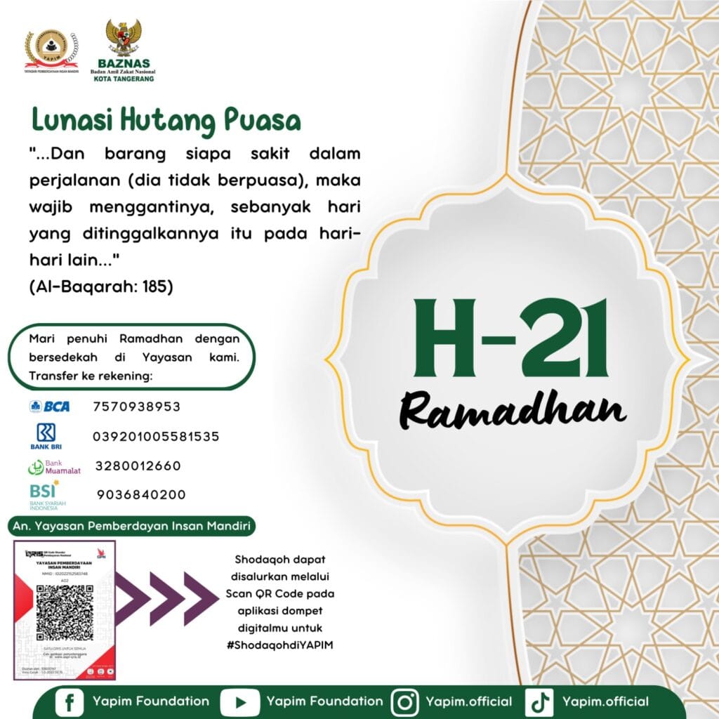 Lunasi hutang puasa ramadhan. Jika Kita memiiliki hutang puasa maka wajib untuk membayarnya jika tidak membayar dengan puasa maka di