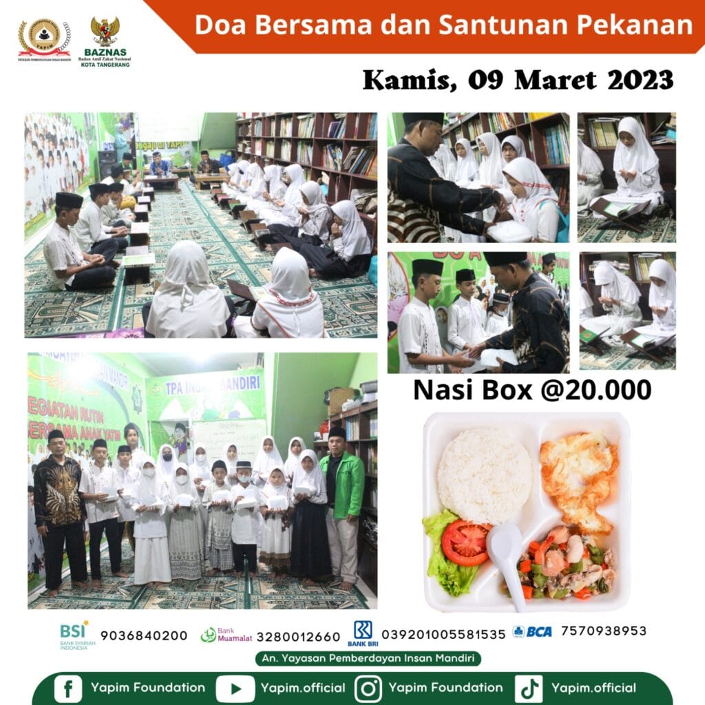 Alhamdulillah kegiatan rutin di Yayasan Pemberdayaan Insan Mandiri yaitu doa bersama. Kami mengucapkan syukur dan terimakasih kepada para Donatur yang